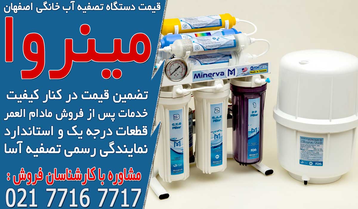 شما میتوانید برای اطلاع از قیمت انواع دستگاه تصفیه آب خانگی تصفیه آسا با کارشناسان این شرکت به صورت 24 ساعته ارتباط برقرار نمایید. شرکت تصفیه آسا علاوه بر نمایندگی تصفیه آب در اصفهان، به عرضه بهترین دستگاه تصفیه آب خانگی ایرانی با قطعات آمریکایی تایوانی و بهترین مارک دستگاه تصفیه آب خانگی تایوانی تصفیه آسا میپردازد که طبق استاندارد جهانی بهداشت آب آشامیدنی شهری را تصفیه و سختی آب را کاهش میدهد. بهترین تصفیه آب خانگی تصفیه آسا، برند مینروا Minerva تایوان است که دارای گارانتی قیمت نیز بوده و در سراسر ایران با بهترین قیمت در اختیار شما قرار خواهد گرفت.
